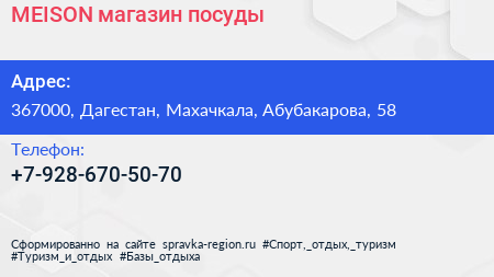 MEISON, магазин посуды по адресу 367000, Дагестан, Махачкала, Абубакарова, 58 в дальнейшем Организация, размещена в следующих категориях:
