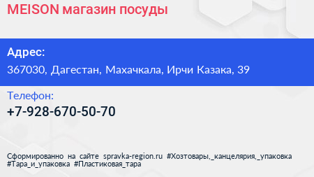MEISON, магазин посуды по адресу 367030, Дагестан, Махачкала, Ирчи Казака, 39 в дальнейшем Организация, размещена в следующих категориях: