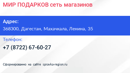 МИР ПОДАРКОВ, сеть магазинов по адресу 368300, Дагестан, Махачкала, Ленина, 35 в дальнейшем Организация, размещена в следующих категориях:
