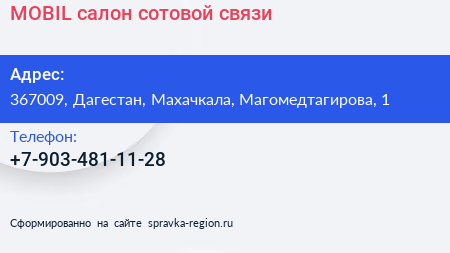 MOBIL, салон сотовой связи по адресу 367009, Дагестан, Махачкала, Магомедтагирова, 1 в дальнейшем Организация, размещена в следующих категориях: