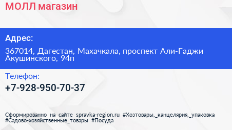 МОЛЛ, магазин по адресу 367014, Дагестан, Махачкала, проспект Али-Гаджи Акушинского, 94п в дальнейшем Организация, размещена в следующих категориях: