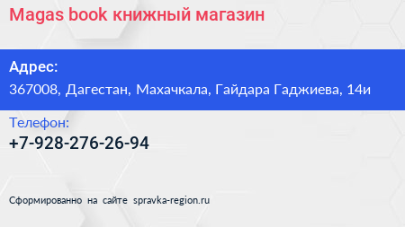 Magas book, книжный магазин по адресу 367008, Дагестан, Махачкала, Гайдара Гаджиева, 14и в дальнейшем Организация, размещена в следующих категориях: