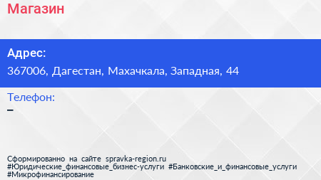 Магазин по адресу 367006, Дагестан, Махачкала, Западная, 44 в дальнейшем Организация, размещена в следующих категориях: