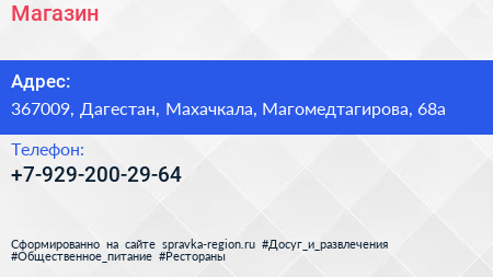 Магазин по адресу 367009, Дагестан, Махачкала, Магомедтагирова, 68а в дальнейшем Организация, размещена в следующих категориях:
