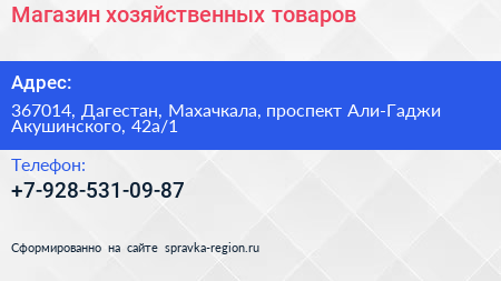 Магазин хозяйственных товаров по адресу 367014, Дагестан, Махачкала, проспект Али-Гаджи Акушинского, 42а/1 в дальнейшем Организация, размещена в следующих категориях: