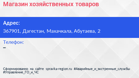 Магазин хозяйственных товаров по адресу 367901, Дагестан, Махачкала, Абутаева, 2 в дальнейшем Организация, размещена в следующих категориях: