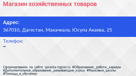 Магазин хозяйственных товаров по адресу 367010, Дагестан, Махачкала, Юсупа Акаева, 25 в дальнейшем Организация, размещена в следующих категориях: