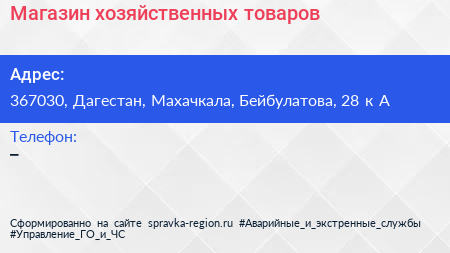Магазин хозяйственных товаров по адресу 367030, Дагестан, Махачкала, Бейбулатова, 28 к А в дальнейшем Организация, размещена в следующих категориях: