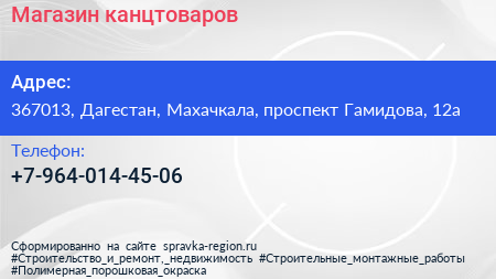 Магазин канцтоваров по адресу 367013, Дагестан, Махачкала, проспект Гамидова, 12а в дальнейшем Организация, размещена в следующих категориях: