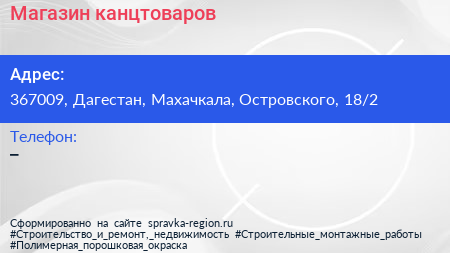 Магазин канцтоваров по адресу 367009, Дагестан, Махачкала, Островского, 18/2 в дальнейшем Организация, размещена в следующих категориях: