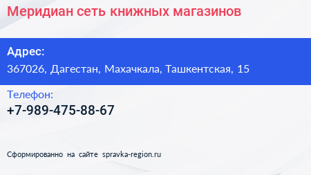 Меридиан, сеть книжных магазинов по адресу 367026, Дагестан, Махачкала, Ташкентская, 15 в дальнейшем Организация, размещена в следующих категориях: