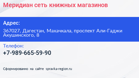 Меридиан, сеть книжных магазинов по адресу 367027, Дагестан, Махачкала, проспект Али-Гаджи Акушинского, 8 в дальнейшем Организация, размещена в следующих категориях:
