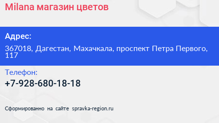 Milana, магазин цветов по адресу 367018, Дагестан, Махачкала, проспект Петра Первого, 117 в дальнейшем Организация, размещена в следующих категориях: