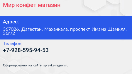 Мир конфет, магазин по адресу 367026, Дагестан, Махачкала, проспект Имама Шамиля, 36г/2 в дальнейшем Организация, размещена в следующих категориях: