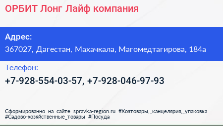 ОРБИТ Лонг Лайф, компания по адресу 367027, Дагестан, Махачкала, Магомедтагирова, 184а в дальнейшем Организация, размещена в следующих категориях: