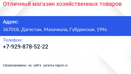 Отличный, магазин хозяйственных товаров по адресу 367018, Дагестан, Махачкала, Губденская, 199а в дальнейшем Организация, размещена в следующих категориях: