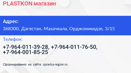 PLASTKON, магазин по адресу 368300, Дагестан, Махачкала, Орджоникидзе, 3/15 в дальнейшем Организация, размещена в следующих категориях: