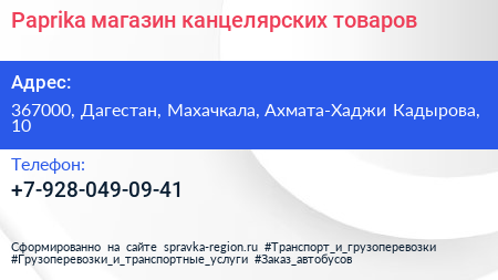 Paprika, магазин канцелярских товаров по адресу 367000, Дагестан, Махачкала, Ахмата-Хаджи Кадырова, 10 в дальнейшем Организация, размещена в следующих категориях: