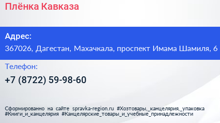Плёнка Кавказа по адресу 367026, Дагестан, Махачкала, проспект Имама Шамиля, 6 в дальнейшем Организация, размещена в следующих категориях: