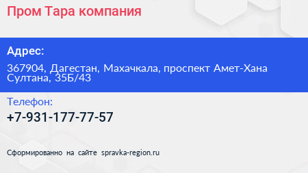 Пром-Тара, компания по адресу 367904, Дагестан, Махачкала, проспект Амет-Хана Султана, 35Б/43 в дальнейшем Организация, размещена в следующих категориях:
