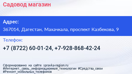 Садовод, магазин по адресу 367014, Дагестан, Махачкала, проспект Казбекова, 9 в дальнейшем Организация, размещена в следующих категориях: