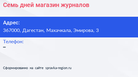 Семь дней, магазин журналов по адресу 367000, Дагестан, Махачкала, Эмирова, 3 в дальнейшем Организация, размещена в следующих категориях: