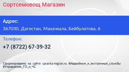 Сортсемовощ, Магазин по адресу 367030, Дагестан, Махачкала, Бейбулатова, 6 в дальнейшем Организация, размещена в следующих категориях: