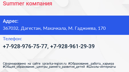 Summer, компания по адресу 367032, Дагестан, Махачкала, М. Гаджиева, 170 в дальнейшем Организация, размещена в следующих категориях: