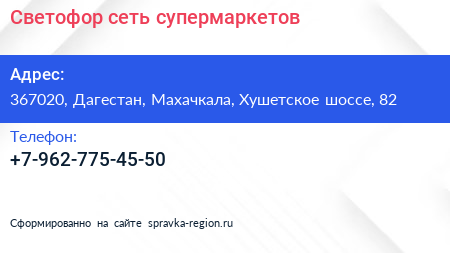 Светофор, сеть супермаркетов по адресу 367020, Дагестан, Махачкала, Хушетское шоссе, 82 в дальнейшем Организация, размещена в следующих категориях: