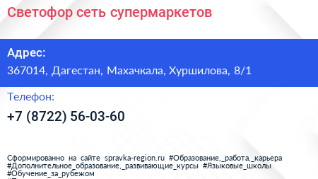Светофор, сеть супермаркетов по адресу 367014, Дагестан, Махачкала, Хуршилова, 8/1 в дальнейшем Организация, размещена в следующих категориях: