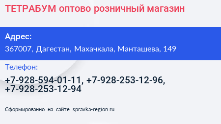 ТЕТРАБУМ, оптово-розничный магазин по адресу 367007, Дагестан, Махачкала, Манташева, 149 в дальнейшем Организация, размещена в следующих категориях: