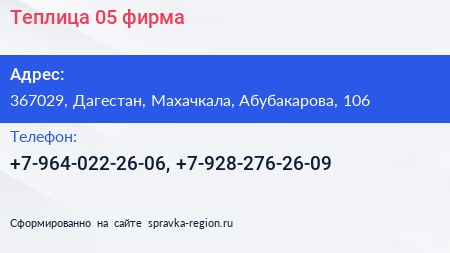 Теплица 05, фирма по адресу 367029, Дагестан, Махачкала, Абубакарова, 106 в дальнейшем Организация, размещена в следующих категориях: