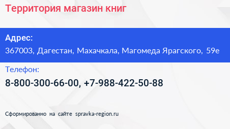Территория, магазин книг по адресу 367003, Дагестан, Махачкала, Магомеда Ярагского, 59е в дальнейшем Организация, размещена в следующих категориях: