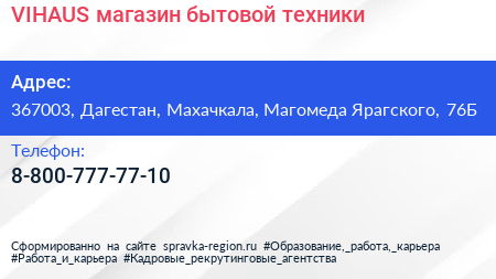 VIHAUS, магазин бытовой техники по адресу 367003, Дагестан, Махачкала, Магомеда Ярагского, 76Б в дальнейшем Организация, размещена в следующих категориях: