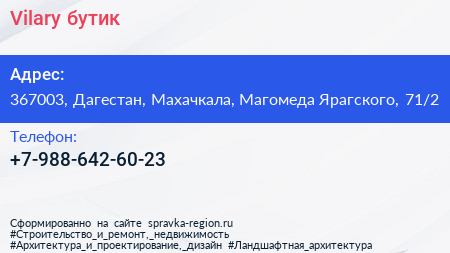 Vilary, бутик по адресу 367003, Дагестан, Махачкала, Магомеда Ярагского, 71/2 в дальнейшем Организация, размещена в следующих категориях: