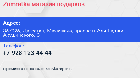 Zumratka, магазин подарков по адресу 367026, Дагестан, Махачкала, проспект Али-Гаджи Акушинского, 3 в дальнейшем Организация, размещена в следующих категориях: