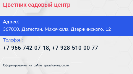 Цветник, садовый центр по адресу 367000, Дагестан, Махачкала, Дзержинского, 12 в дальнейшем Организация, размещена в следующих категориях: