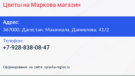 Цветы на Маркова, магазин по адресу 367000, Дагестан, Махачкала, Даниялова, 41/2 в дальнейшем Организация, размещена в следующих категориях: