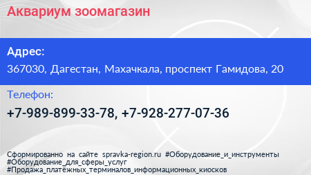 Аквариум, зоомагазин по адресу 367030, Дагестан, Махачкала, проспект Гамидова, 20 в дальнейшем Организация, размещена в следующих категориях: