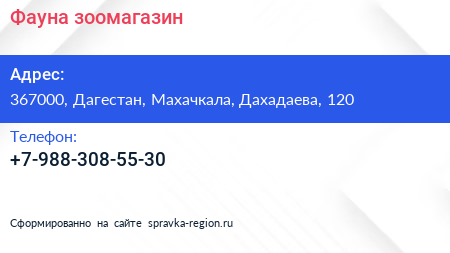 Фауна, зоомагазин по адресу 367000, Дагестан, Махачкала, Дахадаева, 120 в дальнейшем Организация, размещена в следующих категориях: