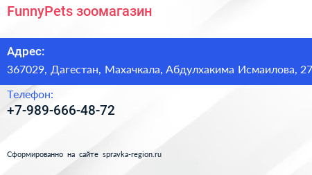 FunnyPets, зоомагазин по адресу 367029, Дагестан, Махачкала, Абдулхакима Исмаилова, 27 в дальнейшем Организация, размещена в следующих категориях: