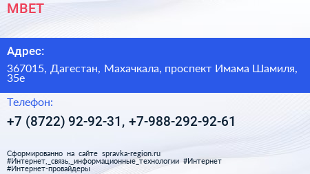 МВЕТ по адресу 367015, Дагестан, Махачкала, проспект Имама Шамиля, 35е в дальнейшем Организация, размещена в следующих категориях:
