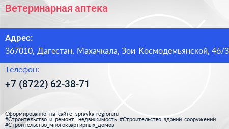 Ветеринарная аптека по адресу 367010, Дагестан, Махачкала, Зои Космодемьянской, 46/3 в дальнейшем Организация, размещена в следующих категориях: