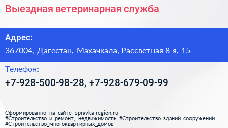 Выездная ветеринарная служба по адресу 367004, Дагестан, Махачкала, Рассветная 8-я, 15 в дальнейшем Организация, размещена в следующих категориях: