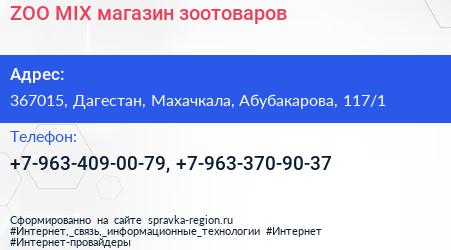 ZOO MIX, магазин зоотоваров по адресу 367015, Дагестан, Махачкала, Абубакарова, 117/1 в дальнейшем Организация, размещена в следующих категориях: