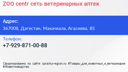 ZOO centr, сеть ветеринарных аптек по адресу 367008, Дагестан, Махачкала, Агасиева, 85 в дальнейшем Организация, размещена в следующих категориях: