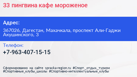 33 пингвина, кафе-мороженое по адресу 367026, Дагестан, Махачкала, проспект Али-Гаджи Акушинского, 3 в дальнейшем Организация, размещена в следующих категориях: