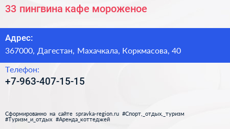 33 пингвина, кафе-мороженое по адресу 367000, Дагестан, Махачкала, Коркмасова, 40 в дальнейшем Организация, размещена в следующих категориях: