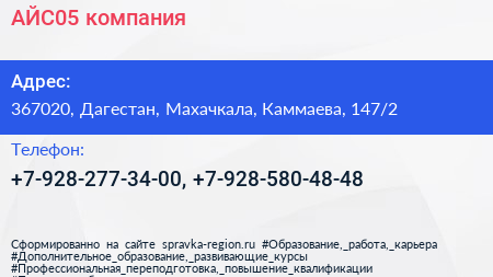 АЙС05, компания по адресу 367020, Дагестан, Махачкала, Каммаева, 147/2 в дальнейшем Организация, размещена в следующих категориях: