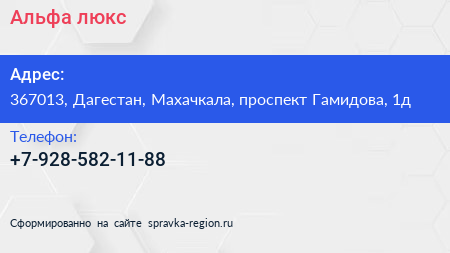 Альфа люкс по адресу 367013, Дагестан, Махачкала, проспект Гамидова, 1д в дальнейшем Организация, размещена в следующих категориях: